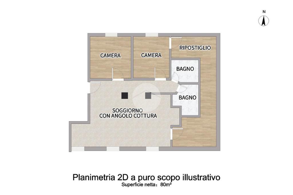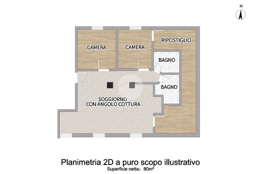 L’ingresso si apre sul soggiorno con angolo cottura, dal quale si accede al disimpegno che conduce alla zona notte composta da due camere da letto: una matrimoniale ed una singola. I doppi servizi, entrambi finestrati, presentano rispettivamente box doccia e vasca, garantendo praticità e comfort. È inoltre presente un ripostiglio, utile per ottimizzare gli spazi.