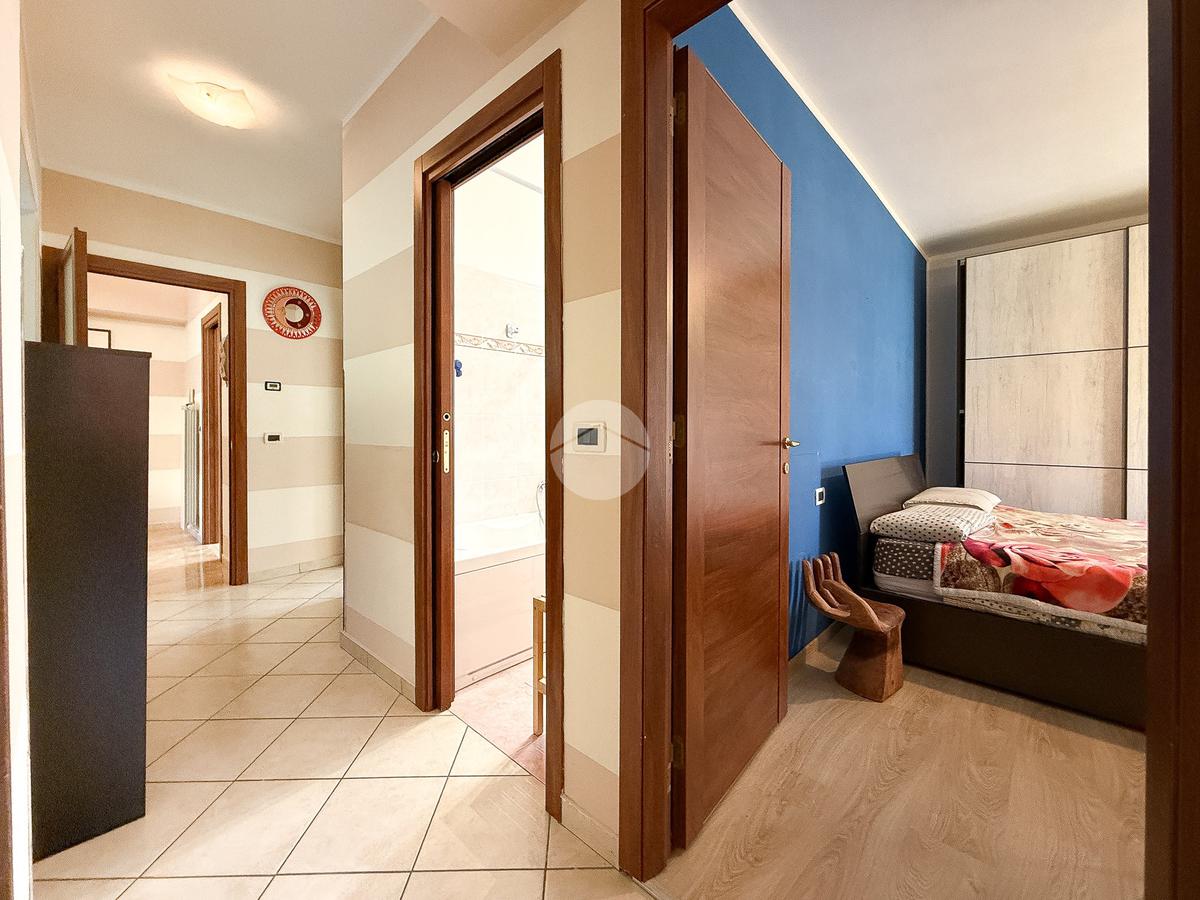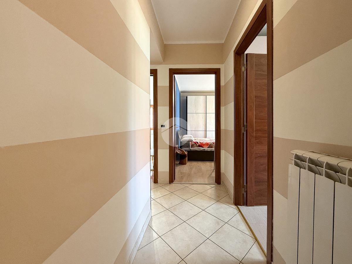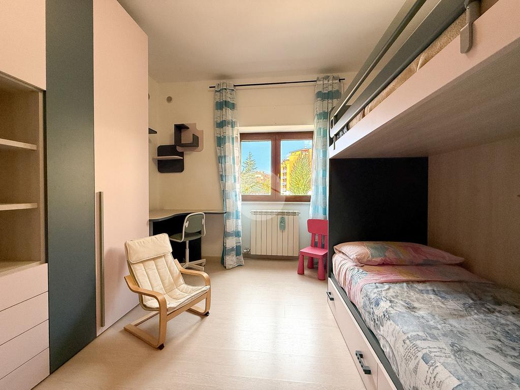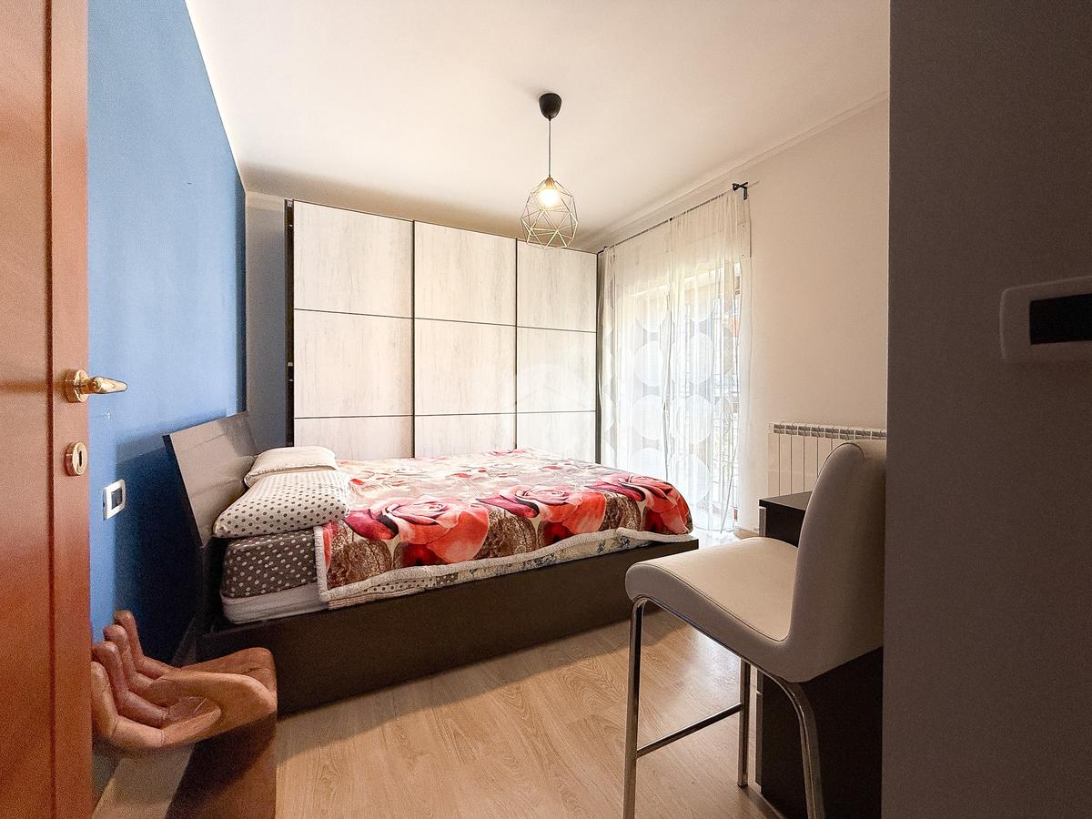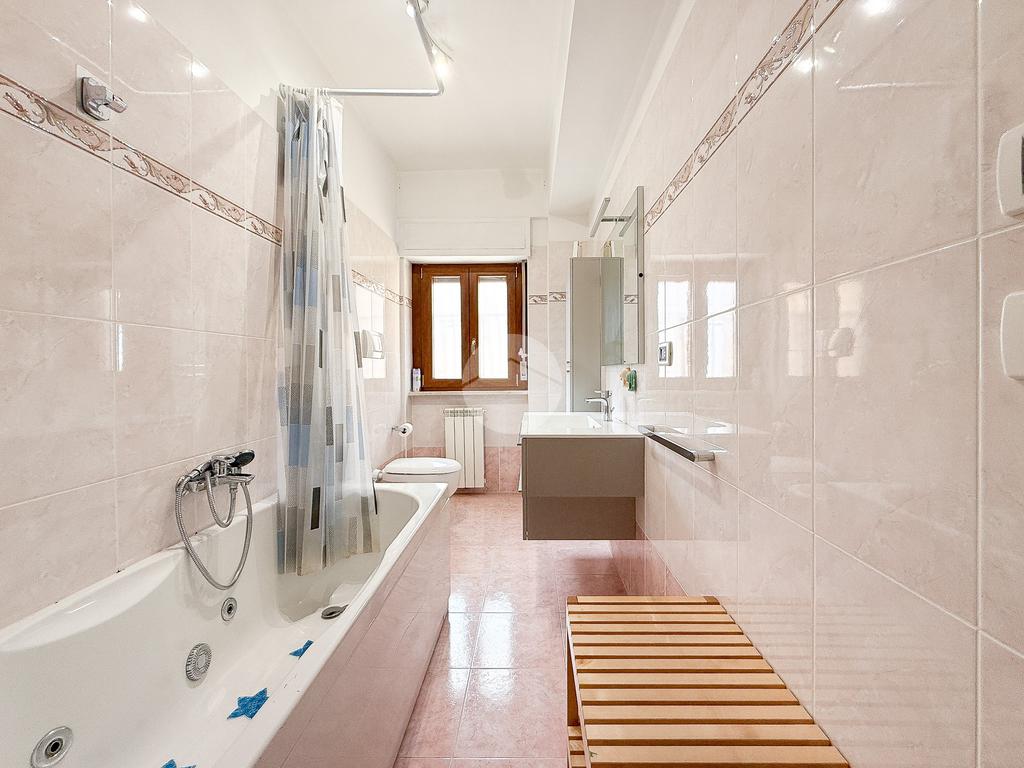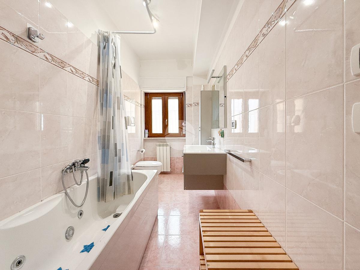 La zona notte è composta da tre camere da letto — due matrimoniali, entrambe con balcone privato, e una singola — oltre a due bagni finestrati, uno con vasca e l’altro con doccia.