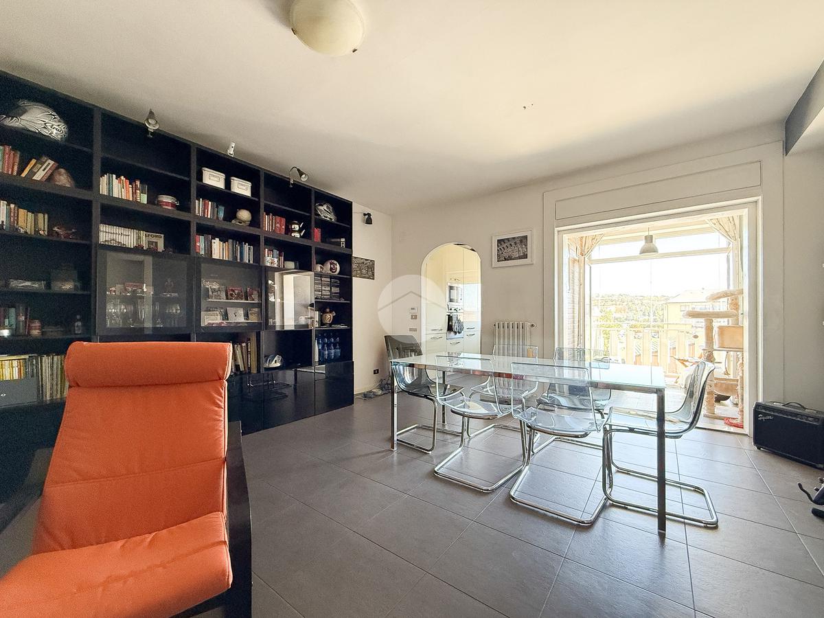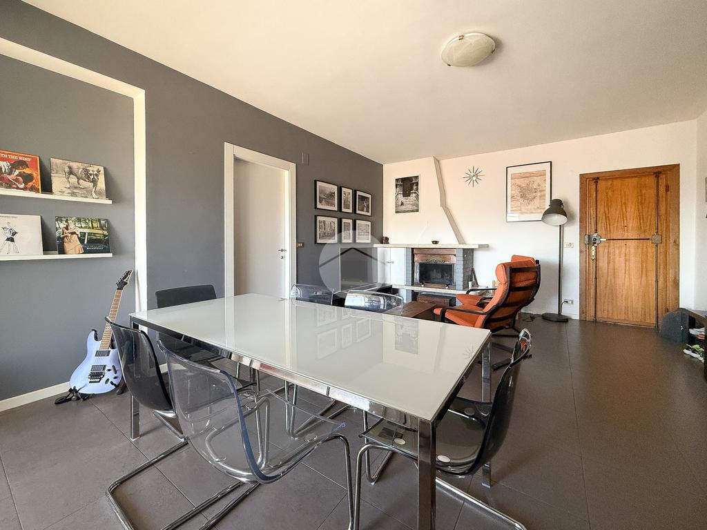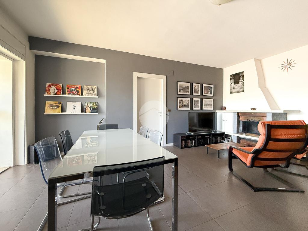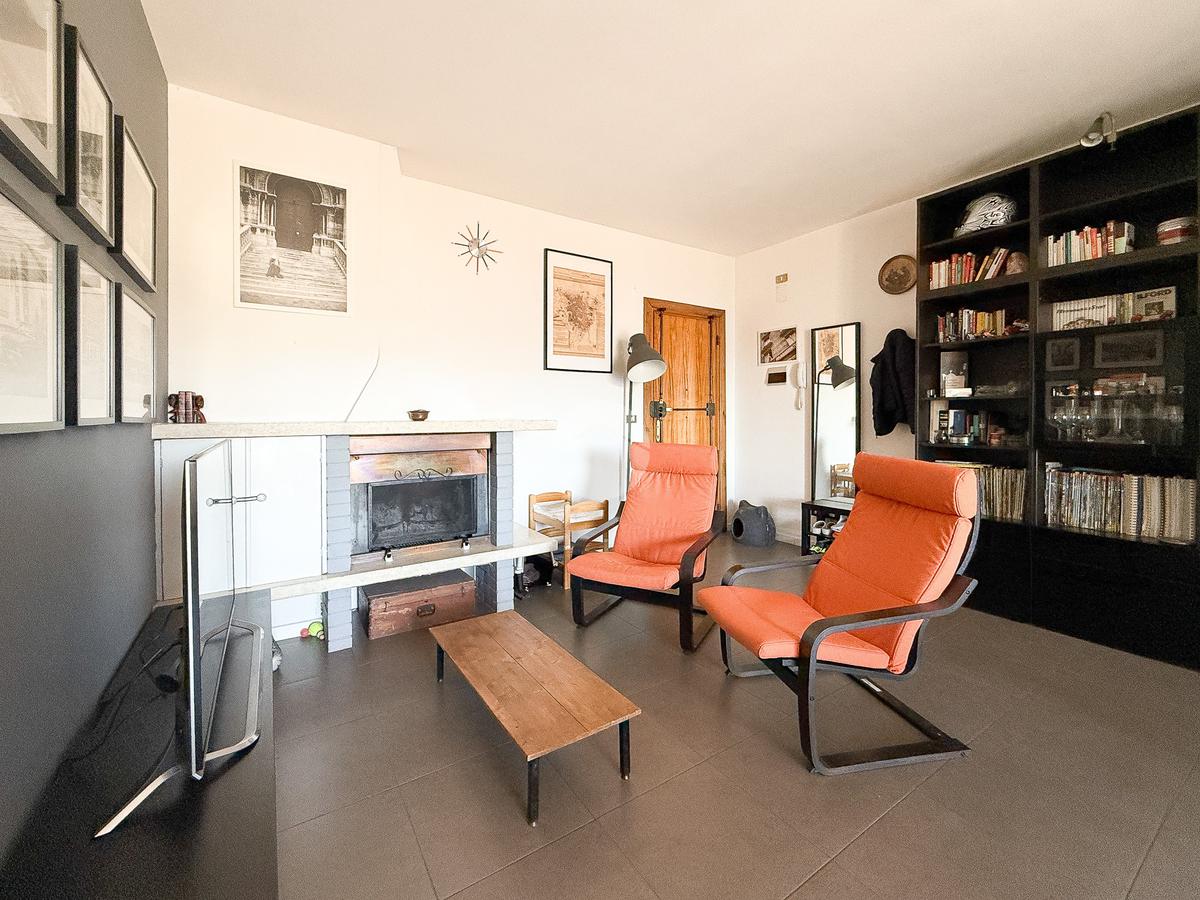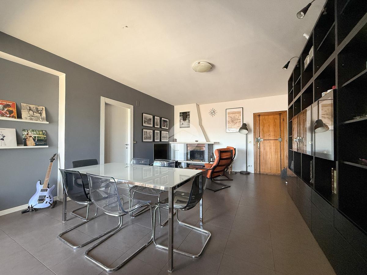L’ingresso si apre su un luminoso soggiorno con camino, balcone e angolo cottura, perfetto per vivere la zona giorno in modo pratico e conviviale.