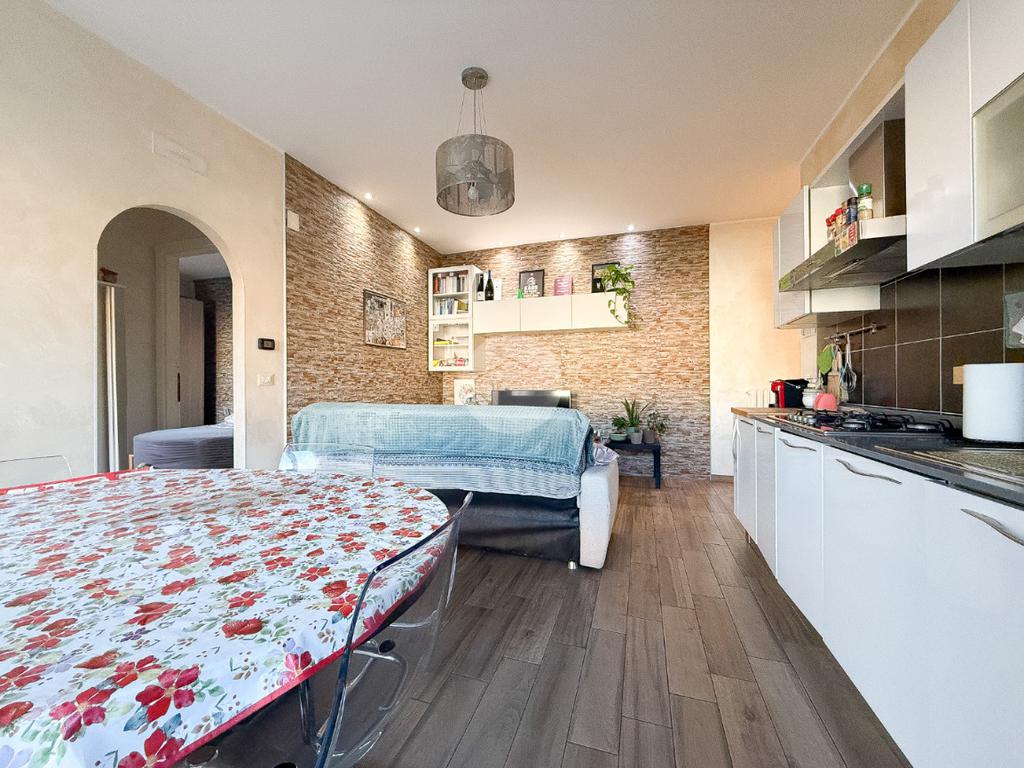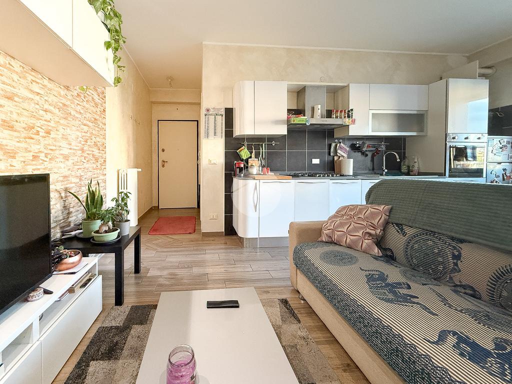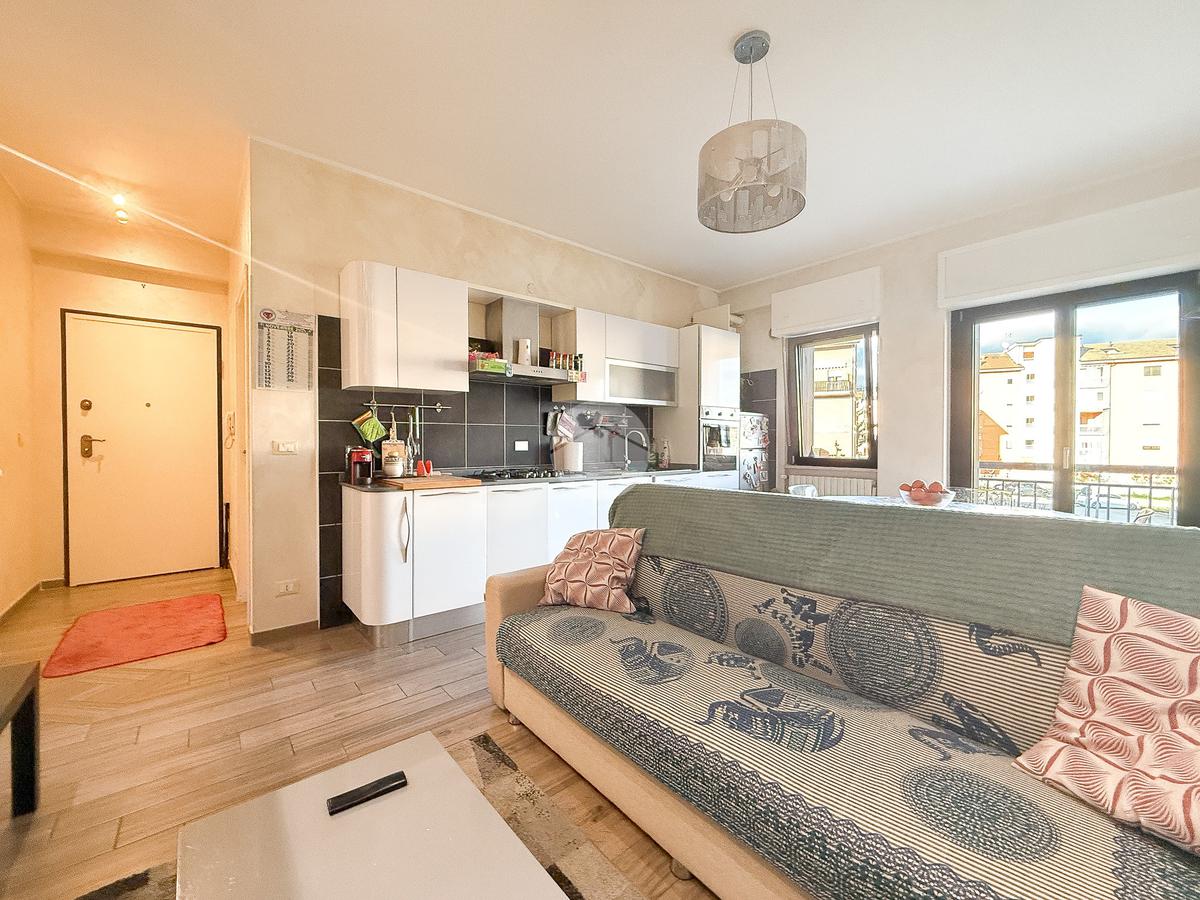 L’ingresso si apre su un disimpegno che conduce prima alla camera singola, poi alla camera matrimoniale con porta finestra e al bagno finestrato con piatto doccia. Il soggiorno con angolo cottura ha accesso al balcone, ideale per vivere la zona giorno in modo pratico.