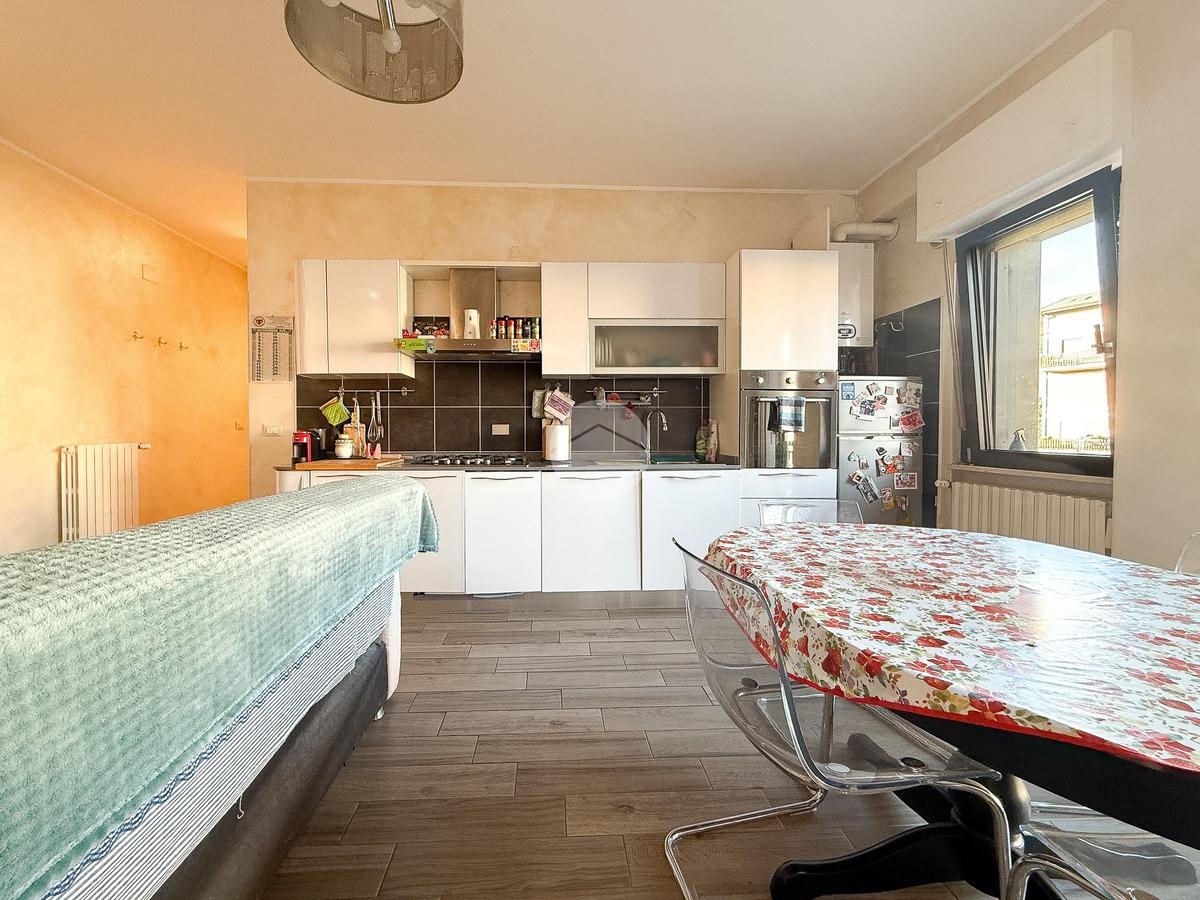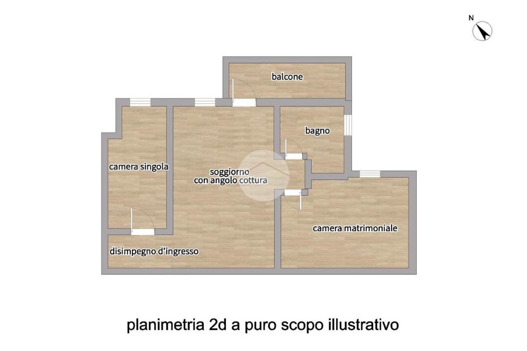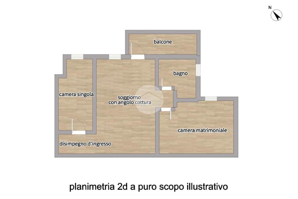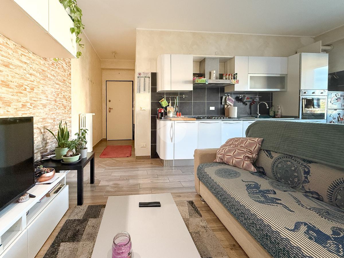 L’ingresso si apre su un disimpegno che conduce prima alla camera singola, poi alla camera matrimoniale con porta finestra e al bagno finestrato con piatto doccia. Il soggiorno con angolo cottura ha accesso al balcone, ideale per vivere la zona giorno in modo pratico.